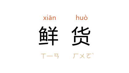 ⒈ 指新鲜的蔬菜、水果、鱼虾等。