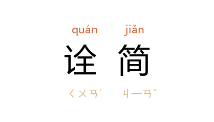 引《隋书·李德林传》:“於六七百万户内,詮简数百县令,犹不能称其才,乃欲於一乡之内,选一人能治五百家者,必恐难得。”《宋代三次农民起义史料汇编》附录《魔尼教残经》:“每寺尊者,詮简三人。”