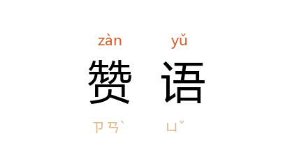 引《儿女英雄传》第三四回:“那 程师爷 的批语不过照例几句通套讚语。”论赞的文词。 汉 班固 《典引》序:“太史迁 下赞语中,寧有非耶?”唐 刘知几 《史通·论赞》:“及后来赞语之作,多録纪传之言,其有所异,唯加文饰而已。”郭沫若 《蒲剑集·屈原的艺术与思想》:“但据我的研究,应以 司马迁 的赞语为准。”