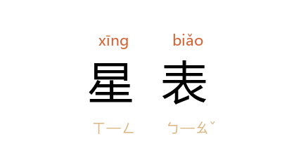 ⒈ 记载恒星的星等、位置等各种特性及相关资料的书表。