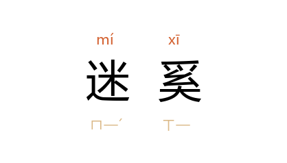 ⒈ 双眼半开半闭。引申为迷糊、昏花。宋·沈端节〈西江月·幸自心肠稳审〉词:「幸自心肠稳审,怎禁眼脑迷奚。」元·高安道〈哨遍·皮匠说谎套·三煞〉:「计数儿算有三千个誓,迷奚著谎眼先陪笑。」也作「瞇?」、「迷希」、「迷稀」。
