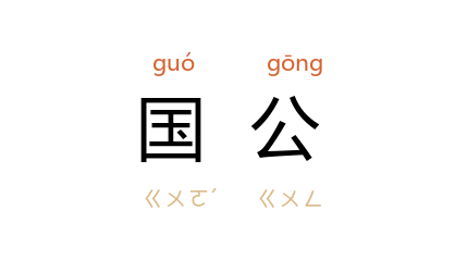 ⒈ 一种爵位。隋朝设置,位次于王而高于郡公,后世沿用至明朝;清朝则仅有宗室及藩部封镇国公、辅国公。