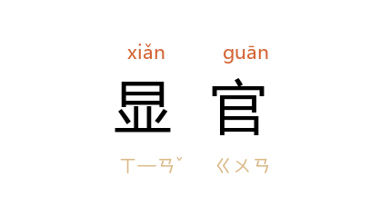 引《后汉书·袁安传》:“逢 弟 隗,少歷显官,先 逢 为三公。”金 王若虚 《臣事实辨下》:“朝廷显官,须公卿子弟为之,盖少习其业,而熟於朝廷臺阁之仪。”清 采蘅子 《虫鸣漫录》卷二:“我都中人,向随显官服役到此。”
