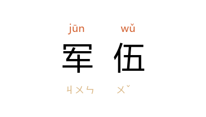 引《管子·问》:“工之巧,出足以利军伍,处可以修城郭补守备者几何人?”《宋史·钱若水传》:“若水 率众过 河,分布军伍,咸有节制。”《三国演义》第一二〇回:“臣闻 孙皓 欲北上,军伍皆已整备。”《诗刊》1978年第5期:“啊,军伍盘绕长蛇阵,汗雨频洒。”