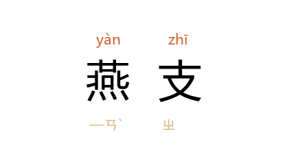 ⒈ 红色颜料。亦泛指红色。可做为化妆品或国画颜料。唐·白居易〈题郡中荔枝诗十八韵兼寄万州杨八使君〉诗:「燕支掌中颗,甘露舌头浆。」唐·殷尧藩〈吹笙歌〉:「伶儿竹声愁绕空,秦女泪湿燕支红。」也作「燕脂」。
