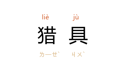 如:「原始部落的族人以自制的刀、箭等猎具,捕杀猎物。」