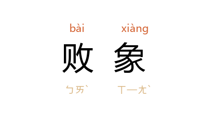 引清 采蘅子 《虫鸣漫录》卷二:“司閽随出询之,答曰:‘满面神色,灰中带黑,头项已相离约寸许,以我法论,当大辟,封产。败象已见,无可挽回矣。’”茅盾 《子夜》十七:“在家庭中,他的威权又已处处露着败象,成了总崩溃!”