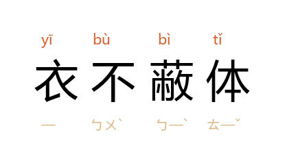 ⒈ 衣服破烂短少,遮蔽不住身体。形容极为穷困。宋·洪迈也作「衣不布体」、「衣不盖体」、「衣不遮身」。