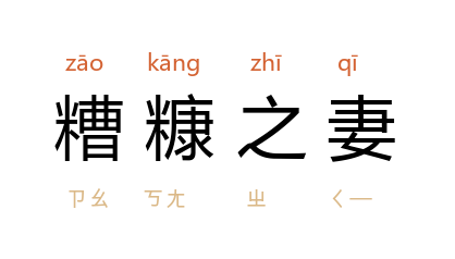 引《后汉书·卷二六·宋弘传》:「臣闻贫贱之知不可忘,糟糠之妻不下堂。」《英烈传·第六五回》:「且使垂白之母,糟糠之妻,天各一方。」