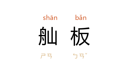 ⒈ 小船。或附挂于海船上;或以长竹束成,用于近海捕鱼;或首尾置炮,两旁具桨,用以作战。也作「舢舨」、「三板」。
