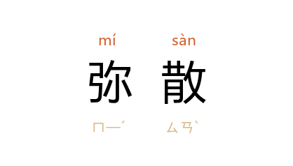 引郭沫若 《女神·凤凰涅槃》:“山上的香烟弥散,山上的火光弥满。”扩散;布满。 鲁迅 《呐喊·社戏》:“那声音大概是横笛,宛转,悠扬,使我的心也沉静,然而又自失起来,觉得要和他弥散在含着豆麦蕴藻之香的夜气里。”郁达夫 《蜃楼》:“而最足以使人感动的,却是弥散在这白茫茫打成一片的天地之间的那种沉默。”