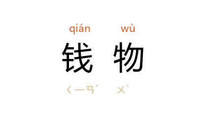 引《后汉书·皇甫嵩传》:“吏有因事受赂者, 嵩 更以钱物赐之,吏怀慙,或至自杀。”晋 葛洪 《抱朴子·自叙》:“或强收钱物以求贵价,或占錮市肆夺百姓之利。”《水浒传》第二二回:“朱仝 自輳些钱物,把与 阎婆,教不要去州里告状。”