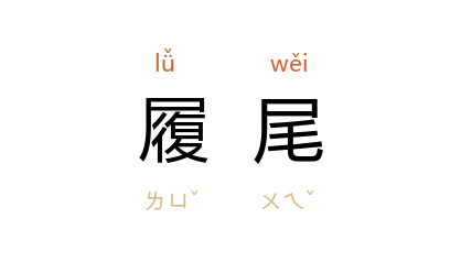 引《晋书·袁宏传》:“仁者必勇,德亦有言,虽遇履尾,神气恬然。”唐 元稹 《授杨元卿泾原节度使制》:“是以陷犲狼之穴,履尾甚危;蓄鹰鶻之心,卑飞待击。”明 陈汝元 《金莲记·构衅》:“偏这生波涛翻覆招人笑,分明履尾招鬚料。教他明朝整顿 西湖 棹,何日重登御水桥。”