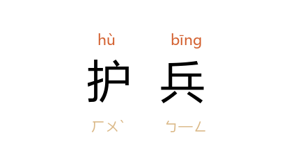引巴金 《家》四十:“隔壁一只船是一个官僚包了的,船上有护兵,岸上有不少的送行者。”老舍 《赵子曰》第二二:“两个护兵一个是粗眉大眼的 山东 人,一个是扁脑杓薄嘴唇的 奉天 人。”