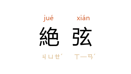⒉ 断绝琴弦。《吕氏春秋·本味》:“伯牙鼓琴,钟子期听之。方鼓琴而志在太山,钟子期曰:'善哉乎鼓琴,巍巍乎若太山。'少选之间,而志在流水,钟子期又曰:'善哉乎鼓琴,汤汤乎若流水。'钟子期死,伯牙破琴絶弦,终身不复鼓琴,以为世无足复为鼓琴者。”此事种子书均有记载,文字略有不同。后遂以“絶弦”喻失去知音。