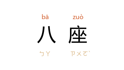 ⒉ 封建时代中央政府的八种高级官员。历朝制度不一,所指不同。东汉以六曹尚书并令、仆射为“八座”;三国魏、南朝宋齐以五曹尚书、二仆射、一令为“八座”;隋唐以六尚书、左右仆射及令为“八座”。清代则用作对六部尚书的称呼。后世文学作品多以指称尚书之类高官。