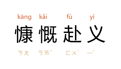 ⒈ 慷慨:意气激昂,情绪激动;赴义:为正义而死。指大义凛然地为正义献身。