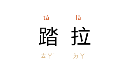 引《红楼梦》第二七回:“正经亲兄弟,鞋蹋拉袜蹋拉的,没人看见,且做这些东西!”老舍 《茶馆》第一幕:“唐铁嘴 踏拉着鞋,身穿一件极长极脏的大布衫,耳上夹着几张小纸片,进来。”柳青 《创业史》第二部第二章:“他赤脚下地,踏拉上鞋。”