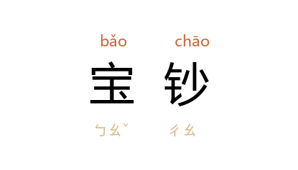 ⒈ 元、明、清 三代发行的一种纸币。 元世祖 中统 元年十月始行“中统宝钞”,面值自十文至二贯文,共九等。 至元 二十四年发行“至元通行宝钞”,自五文至二贯文,共十一等。 明 洪武 八年发行“大明通行宝钞”,自一百文至一贯,共六等,流行一百多年。 清 咸丰 三年,亦曾发行“大清宝钞”。参阅《元史·食货志一》、《明史·食货志五》、《清史稿·食货志五》。