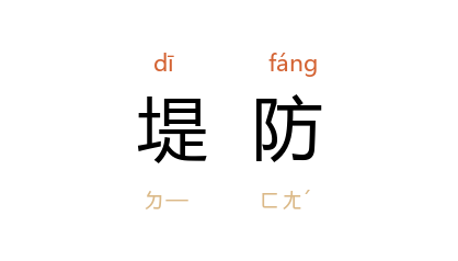 隄防:1.拦水的堤坝。 《礼记·月令》:“﹝孟秋之月﹞命百官,始收敛,完隄防,谨壅塞,以备水潦。”