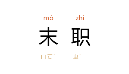 ⒈ 低级官吏。唐孟棨《本事诗·情感》:“韩(韩翃)悒悒殊不得意,多辞疾在家,唯末职韦巡官知其名,与韩独善。”王闿运《〈桂阳州志〉序》:“即山通侻,浮沈末职;晚临南平,政声洋溢。”亦为属员或部下对长官的自称谦词。