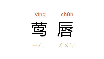 ⒈ 亦作“鶯脣”。 莺嘴。樱唇,樱桃小口。