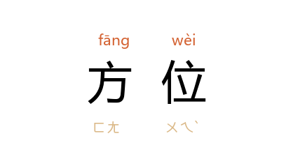 ⒈ 方向位置。东、南、西、北为基本方位;东北、东南等为中间方位。