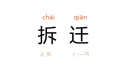 ⒈ 因建设需要,拆除单位或居民房屋,使迁往别处,或暂迁别处俟新屋建成后回迁。应拆迁的住户叫拆迁户。