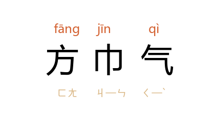 ⒈ 方巾,明朝书生日常戴的帽子。方巾气本指文人气息,后形容人思想、言行迂腐呆板。