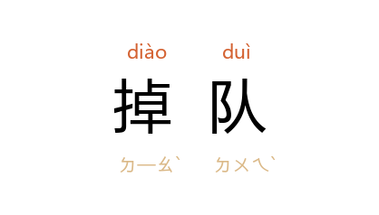 ⒈ 落在队伍的后面。比喻跟不上时代或达不到要求的水平。