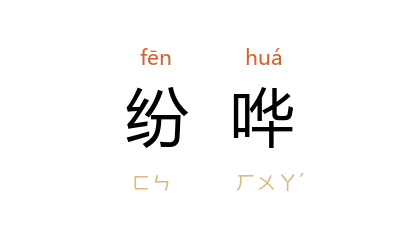 引晋 葛洪 《抱朴子·弭讼》:“创讜言以拾世遗,建嘉谋以拯流遁。纷譁之俗,将以此而易;无耻之风,将由兹而移。”金 元好问 《西斋夜宴》诗:“只欠东山 游録事,不来坚坐看纷譁。”元 吴景奎 《春日杂咏》之三:“野人居处絶纷譁,芳楥疎篱八九家。”