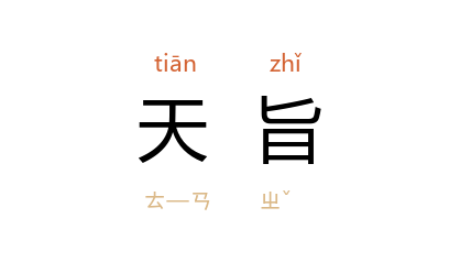 引南朝 梁 刘孝标 《辩命论》:“余谓士之穷通,无非命也。故谨述天旨,因言其致云。”《南史·颜延之传》:“末虑上闻,内怀猜惧,伪请东牧,以卜天旨。”宋 洪迈 《容斋三笔·蔡君谟书碑》:“曏者得侍陛下清光,时有天旨,令写御撰碑文、宫寺题牓。”