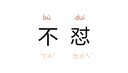 引《国语·周语上》:“事君者险而不懟,怨而不怒。”汉 王褒 《洞箫赋》:“故贪饕者听之而廉隅兮,狼戾者闻之而不懟。”清 蒲松龄 《聊斋志异·陈云栖》:“见有少女在堂,年可十八九,姿容曼妙,目所未睹。夫人每思得一佳妇,俾子不懟,心动,因詰生平。”