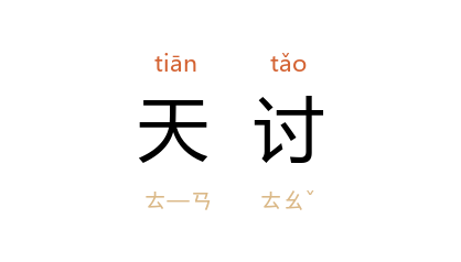 ⒈ 上天的惩治。《书·皋陶谟》:“天讨有罪,五刑五用哉。”后以王师征伐为“天讨”,意谓禀承天意而行。