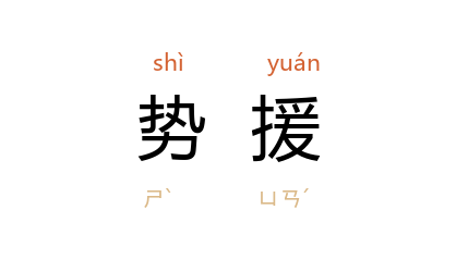 引《后汉书·苏不韦传》:“时 魏郡 李暠 为 美阳 令,与中常侍 具瑗 交通,贪暴为民患,前后监司畏其埶援,莫敢糺问。”《晋书·庾怿传》:“以 懌 宽厚容众,故授以远任,为东西势援。”宋 岳飞 《奏乞除在外宫观第二札子》:“臣起身田野,势援孤单。”