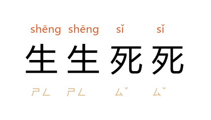 引清 周亮工 《书影》卷二:“宽 復洒泣诉其父母生生死死之苦曰:‘儻伊父母必欲归,且随其主母起居耳。’”贺敬之 《放歌集·向秀丽》:“一人唱呵千万人和--生生死死为祖国!”