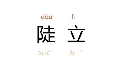 引清 刘大櫆 《游浮山记》:“踰桥而西有巖,石壁陡立不可入。”吴组缃 《山洪》十:“太阳偏斜,挂在顶空。她的光和热被四周重重陡立的山峦屏荫着,显得特别寒冷。”碧野 《富春江畔》:“钓鱼台 分东西两台,是由两条山脊直插江边,临流突起两座屹立的峭壁,巨岩高耸,石壁陡立。”