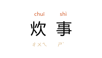 ⒈ 做饭烧菜以及厨房里的其他工作。参见“炊事员”。