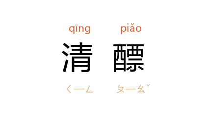 引晋 左思 《蜀都赋》:“觴以清醥,鲜以紫鳞。”唐 杜甫 《聂耒阳书致酒肉》诗:“礼过宰肥羊,愁当置清醥。”仇兆鳌 注:“酒清曰醥。”清 钱谦益 《辛卯春尽歌者王郎北游告别戏题绝句》之十三:“春风作态楝花飞,清醥盈觴照别衣。”