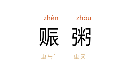 引清 黄六鸿 《福惠全书·荒政·赈济》:“近见北方賑粥,奸胥侵蚀薪价,以石灰块置釜底。粥汤沸起,而粒易熟烂,饥民食之,肠腹澁胀,每多成疾而死。”清 阮元 《雷塘阡表》:“杭州 刱建 普济堂,冬賑粥。”