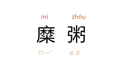 引《礼记·问丧》:“水浆不入口,三日不举火,故邻里为之糜粥以饮食之。”孔颖达 疏:“糜厚而粥薄。”《后汉书·礼仪志中》:“年始七十者,授之以玉杖,餔之以糜粥。”《旧唐书·方伎传·孟詵》:“又令每岁春秋二时,特给羊酒糜粥。”金 元好问 《示崔雷诗社诸人》诗:“江山自许供诗笔,糜粥犹能到酒杯。”