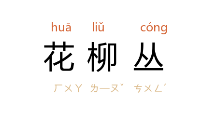 引《清平山堂话本·刎颈鸳鸯会》:「且朱秉中日常在花柳丛中打交,深谙那十要之术。」《初刻拍案惊奇·卷一五》:「我陈衍若再向花柳丛中著脚时,永远前程不吉,死于非命。」