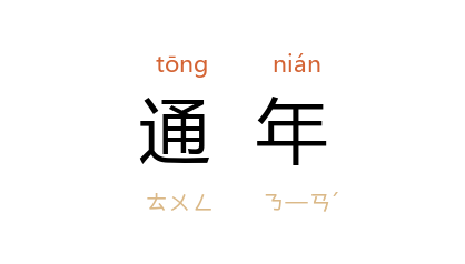 引晋 束晳 《论嫁娶时月》:“通年听婚,盖古之制也。”《扫迷帚》第九回:“通年合算,所费甚巨。”赵树理 《实干家潘永福》:“农家活总有个忙闲,打短工不一定通年有人雇用。”
