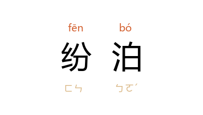 引汉 张衡 《西京赋》:“起彼集此,霍绎纷泊。”《文选·左思<蜀都赋>》:“毛羣陆离,羽族纷泊。”刘逵 注:“纷泊,飞薄也。”吕延济 注:“纷泊,飞扬也。”唐 元稹 《有鸟》诗之十二:“秋鹰掣断架上索,利爪一挥毛血落。可怜鸦鹊慕腥膻,犹向巢边竞纷泊。”宋 王安石 《白日不照物》诗:“风涛吹黄昏,屋瓦更纷泊。”
