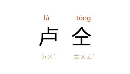 ⒈ 唐代诗人。号玉川子,范阳(今河北涿州)人。曾隐居少室山。甘露之变时,因留宿宰相王涯家,被捕杀。善用散文句法写诗,风格奇特险怪。《月蚀》为其代表作。有《玉川子诗集》。