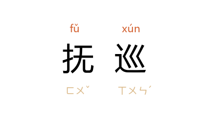 引晋 陆机 《辩亡论上》:“化协殊裔,风衍遐圻,乃俾一介行人,抚巡外域。”《陈书·孙瑒传》:“时 瑒 兵不满千人,乘城拒守, 瑒 亲自抚巡,行酒赋食,士卒皆为之用命。”唐 崔元翰 《奉和登玄武楼观射即事书怀》:“讲事一临幸,加恩徧抚巡。”