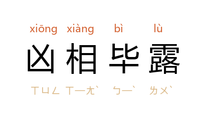 例如:「看到他凶相毕露,一副面目狰狞的模样,她吓呆了!」