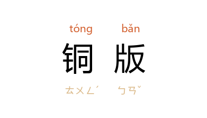 ⒈ 用铜铸成或用铜板刻成的印版。 中国 后晋 天福 年间(公元936-943年)曾用铜版印刷《九经》;十一世纪初, 北宋 更以铜版印纸币和仿单。