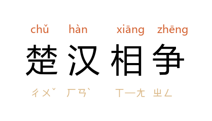 ⒈ 刘邦和项羽争夺全国统治权的战争。秦亡后,项羽自立为西楚霸王,封刘邦为汉王,并分封其他十七人为王。后刘邦乘项羽前往攻击齐地之机,攻占关中,并东进占领项羽根据地彭城(今江苏徐州)。项羽回兵大败刘邦,但刘邦部将韩信攻占赵齐等地,威胁项羽后方。公元前203年,双方约定以鸿沟为界,东属楚,西属汉。次年刘邦主动出击,击败项羽。项羽自杀。刘邦即帝位,建立汉朝。
