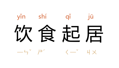 引宋 欧阳修 《祭杜祁公文》:“公为辅弼,饮食起居,如陋巷之士。”《文明小史》第四九回:“劳航芥 又喜欢架弄,一切都讲究,不要説是饮食起居了。”瞿秋白 《饿乡纪程》五:“日常生活刻苦惯的,饮食起居一切都只求简单节欲。”